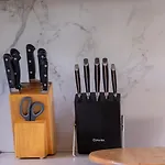 Tea and coffee making equipment are available in a fully furnished kitchen that also features a refrigerator, an oven, and kitchenware